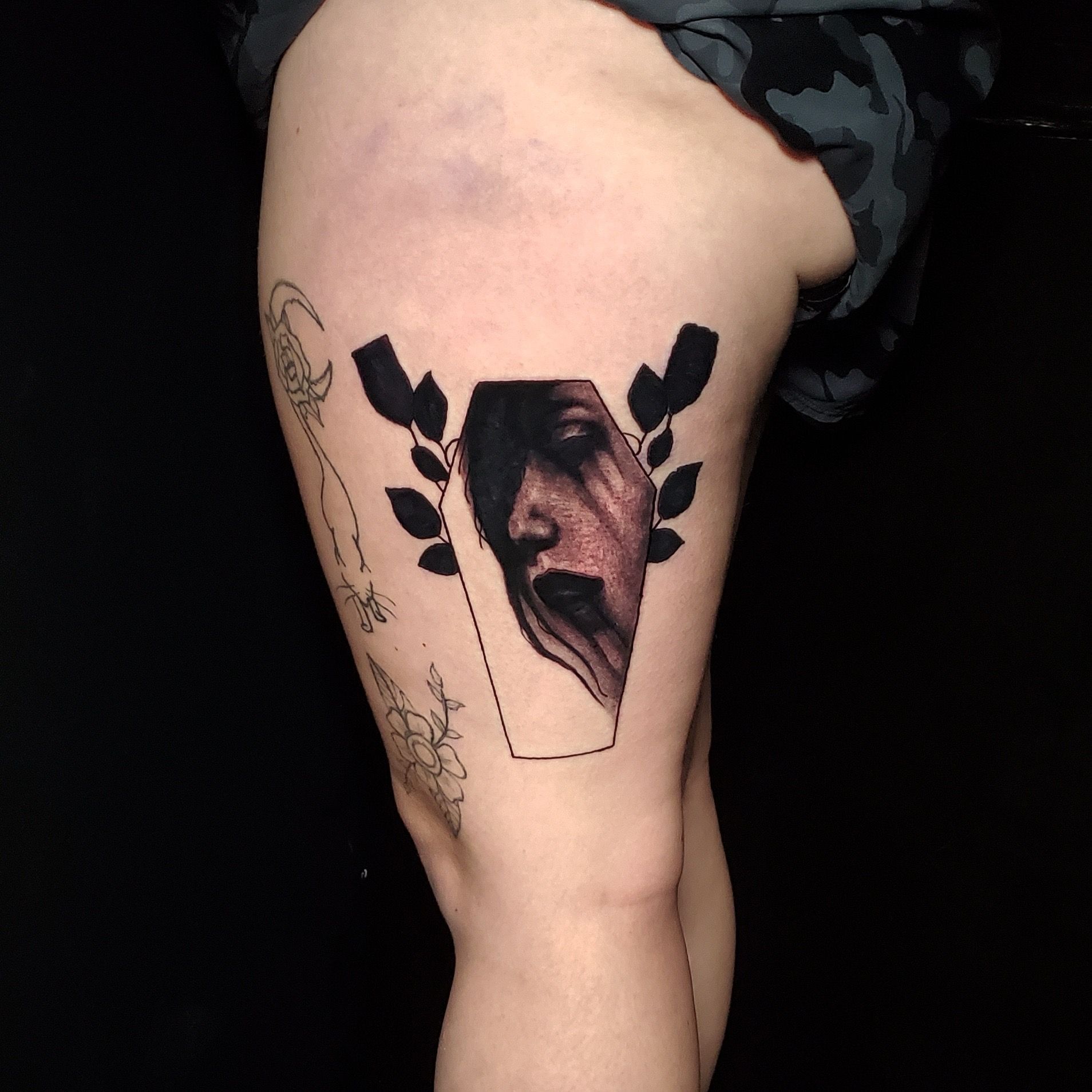 Aby's preferred style of tattooing is dark and gothic types of work. However looking at her work you can tell she has been exposed to lots of styles here at the shop, and definitely doesn't shy away from something new.